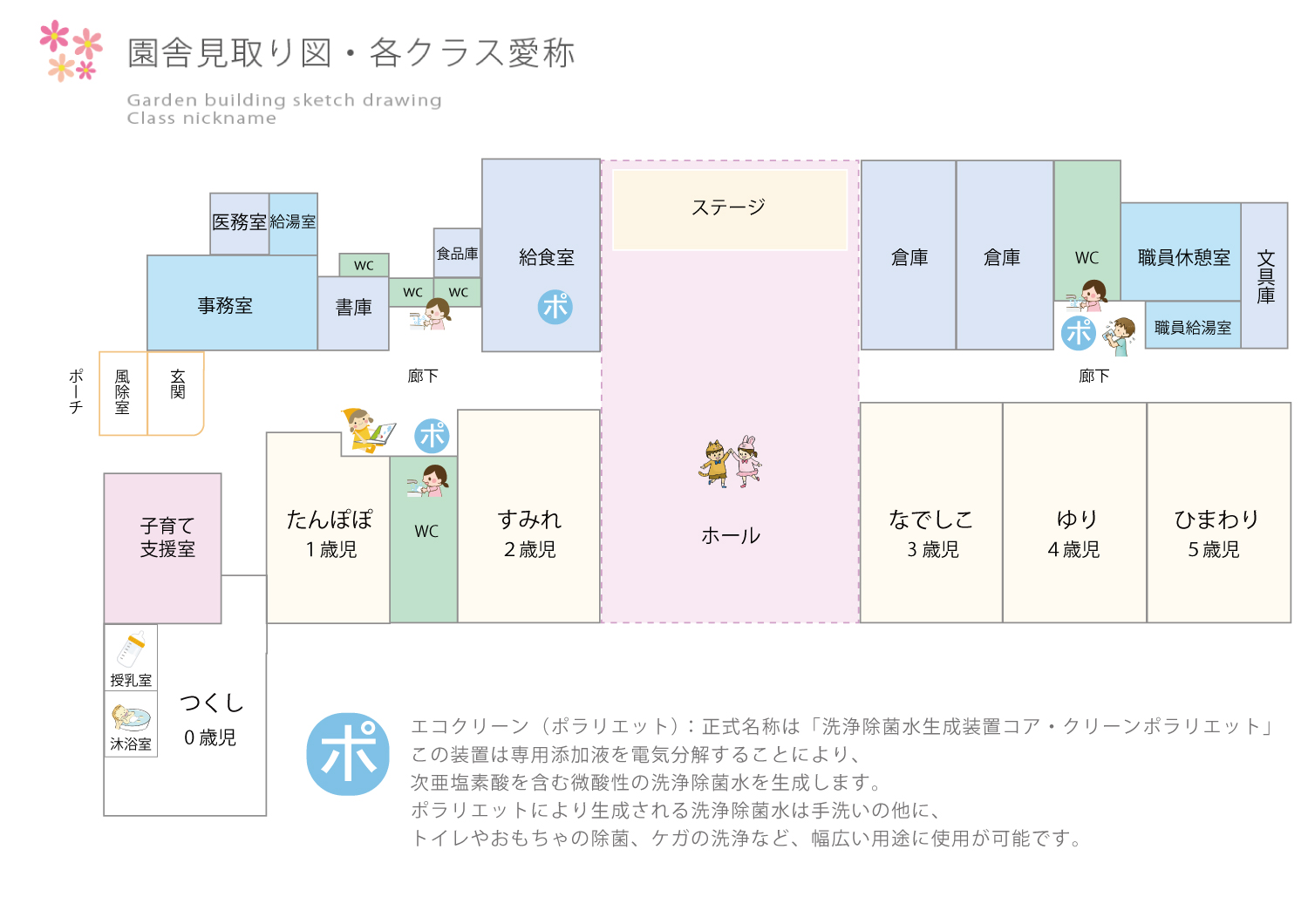 ポラリエットにより生成される洗浄除菌水は手洗いの他に、トイレやおもちゃの除菌、ケガの洗浄など、幅広い用途に使用が可能です。